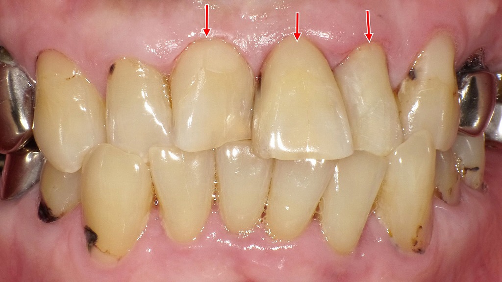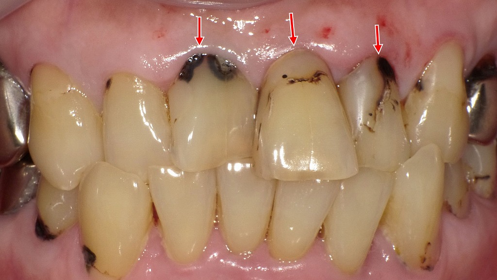 前歯から奥歯まで広がる重度の歯頸部う蝕症例