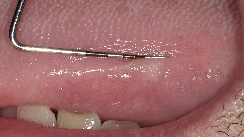 レース状の白い病変が舌の裏側粘膜にできています。これは扁平苔癬です。
