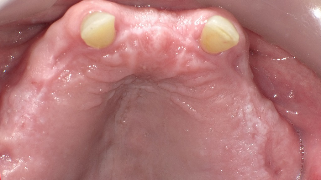 上顎の残存歯は左右2番のみで、広い無歯顎部が確認される状態。レジン床義歯を装着する前の上顎粘膜と歯の配置を示しています。