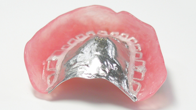 自費診療では、金属製の薄くて丈夫な総入れ歯を選べます。保険のレジン床よりも軽く、違和感が少ないのが魅力です。
