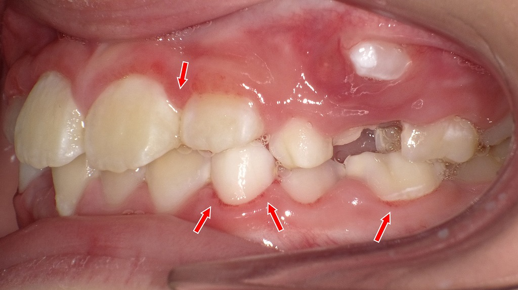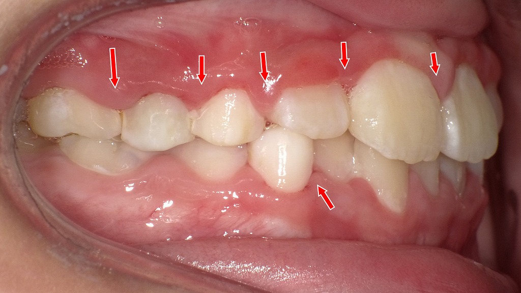 矢印部分は、前歯から乳臼歯にかけて歯ぐきがぷっくり腫れた状態です。
