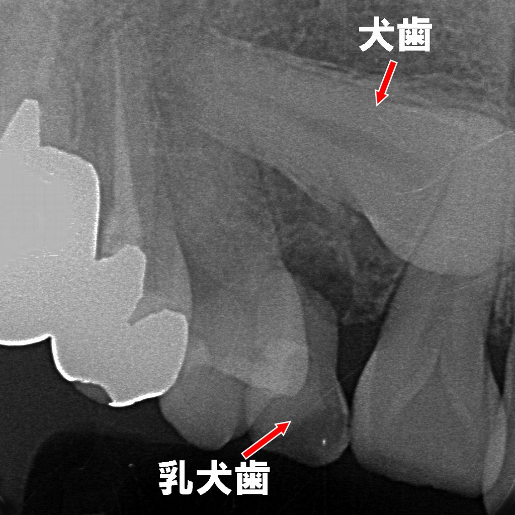 埋伏した永久犬歯が萌出方向を誤り、乳犬歯の根吸収が十分に進まず残存している状態。乳犬歯直下には永久犬歯が水平気味に位置しており、自然脱落しにくい典型的なパターンです。